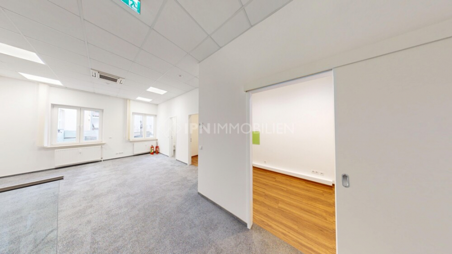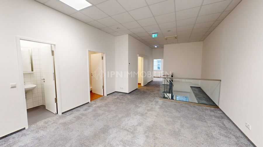 Im geräumigen Erdgeschoss finden Sie genügend Platz, um hier Ihr Geschäft (Laden, Café oder Galerie) einzurichten. Von hier aus führt Sie die offene Treppe in das erste Obergeschoss. Hier finden Sie zwei separat begehbarer Büroräume, die Küche, einen Lagerraum sowie genügend Platz für weitere Verkaufsflächen oder Arbeitsplätze.