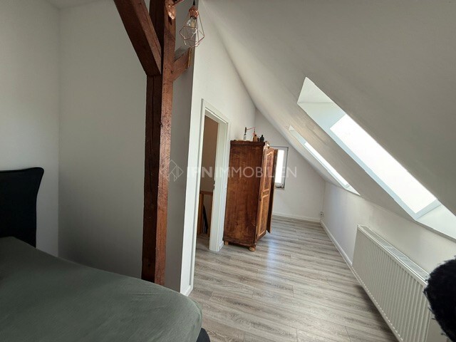 Das Endstück eines Hauses ist vor wenigen Jahren modernisiert worden. Eine kleine Terrasse sowie ein Parkplatz sind im Mietpreis inklusive. Über 70 m² verteilen sich drei Zimmer sowie zwei Bäder. Im Erdgeschoss mit Dusche und im Obergeschoss mit Badewanne. Vinyl-Böden und glatte, weiße Wände geben dem Wohnraum einen modernen Charakter. Das leben spielt sich hauptsächlich im Erdgeschoss und damit im Wohnbereich mit offener Küche ab. eine Einbauküche ist vorhanden. Wohnzimmer mit offener Küche sowie eines der beiden Bäder befinden sich im Erdgeschoss – zwei Zimmer sowie zweites Bad im Obergeschoss.