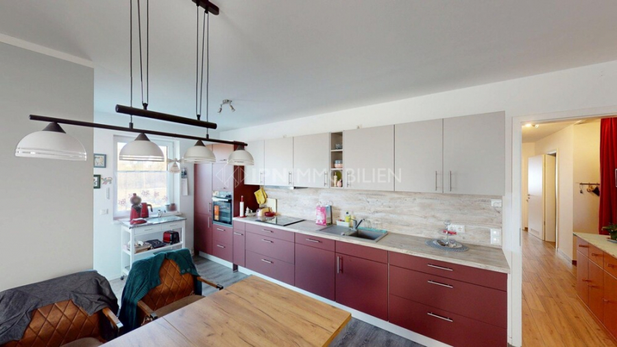 Der offene Wohn- und Küchenbereich verfügt über eine hochwertige Einbauküche und bildet das Herzstück der Wohnung. Insgesamt stehen drei gut geschnittene Zimmer zur Verfügung.