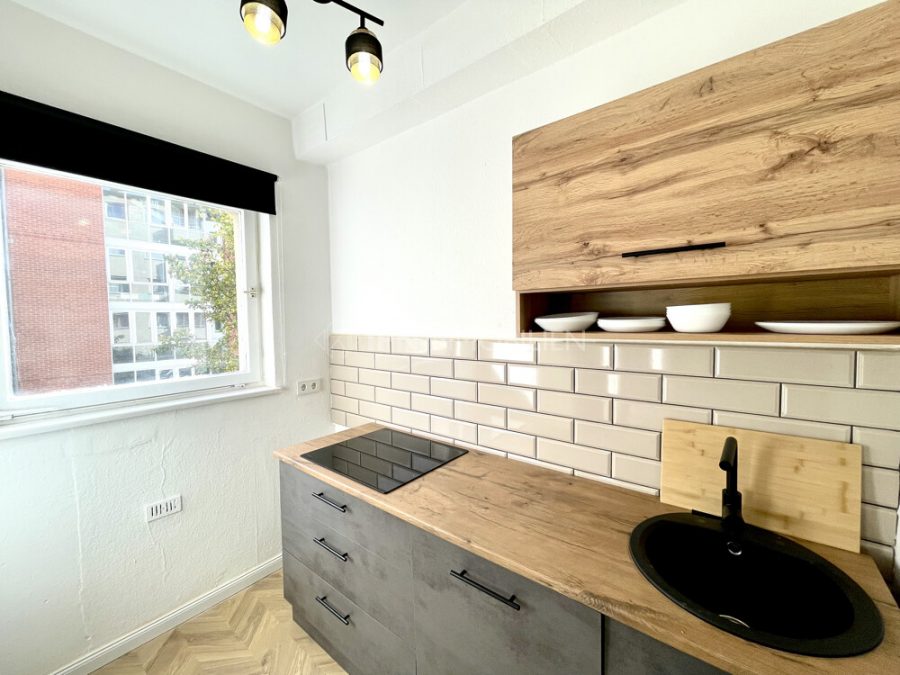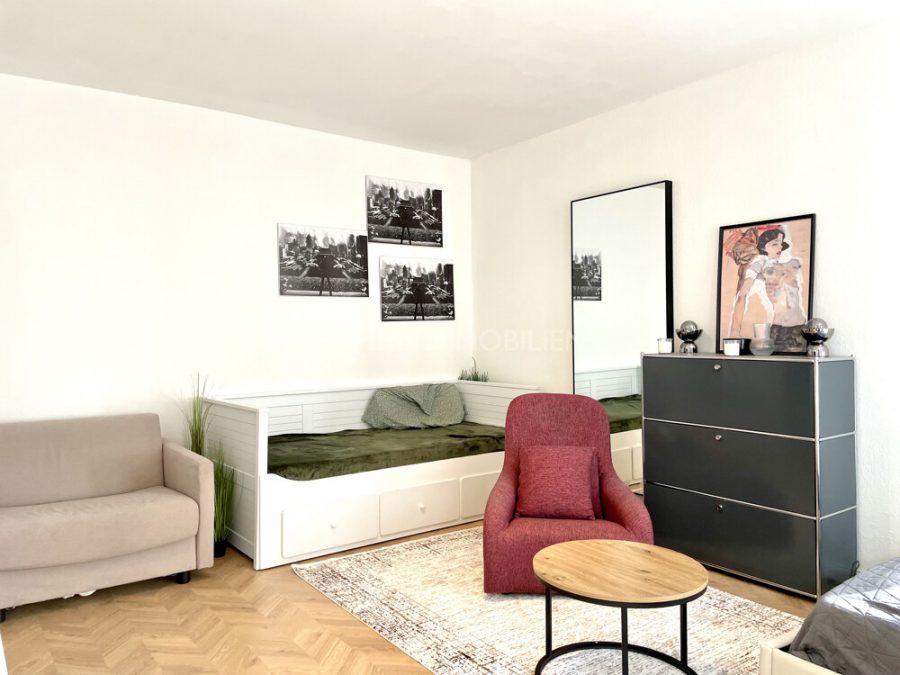 Beim Betreten der Wohnung empfängt Sie ein praktischer Eingangsbereich mit Garderobe, der nahtlos in den hellen Wohn- und Schlafraum übergeht. Der Design-Vinylboden wurde 2025 erneuert und verleiht dem Raum eine moderne, warme Atmosphäre.